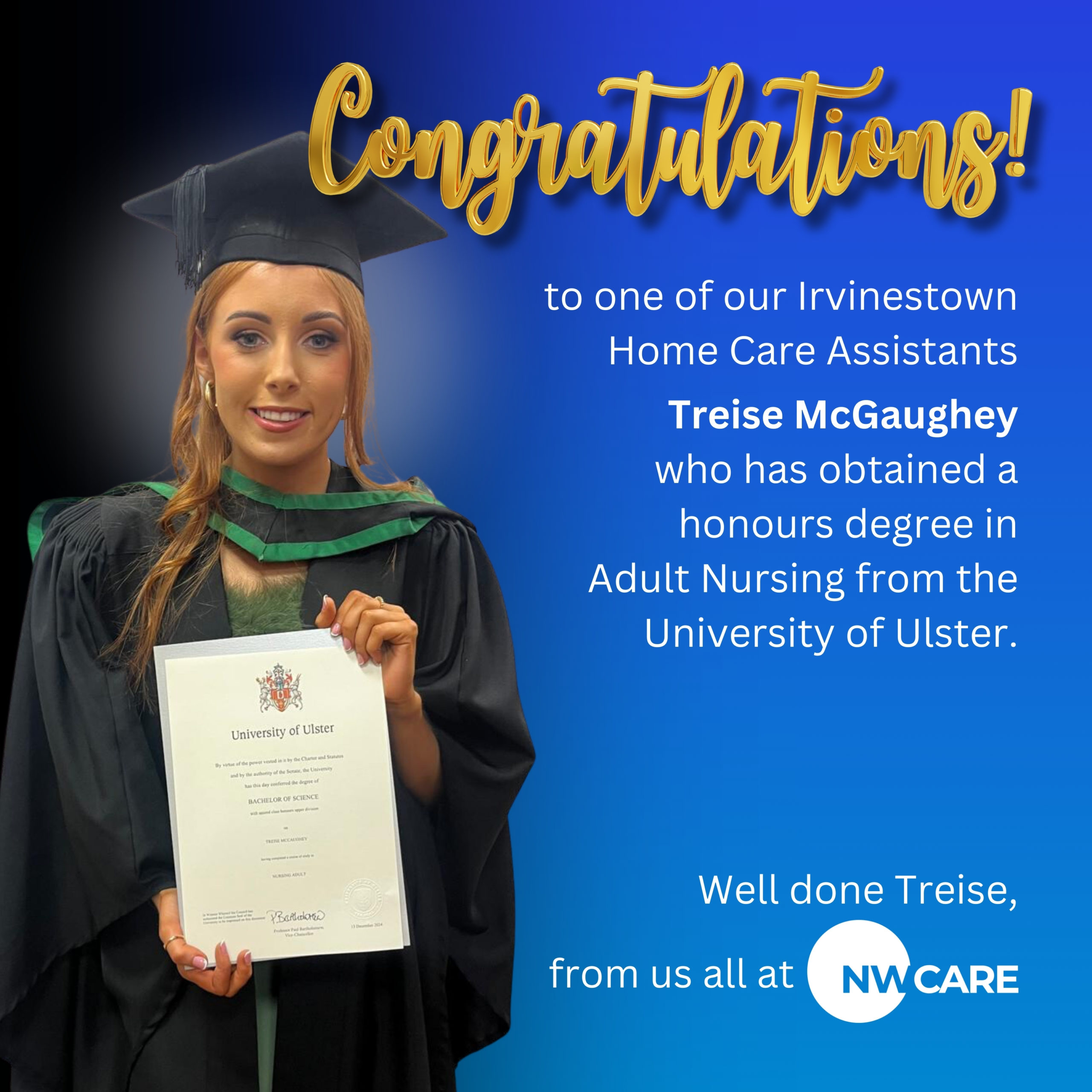 Treise McGaughey is on our Irvinestown team and has graduated as a nurse. She has been with NWCare for 4 years now. Treise says ‘It’s been a big help to getting me to where I am now’