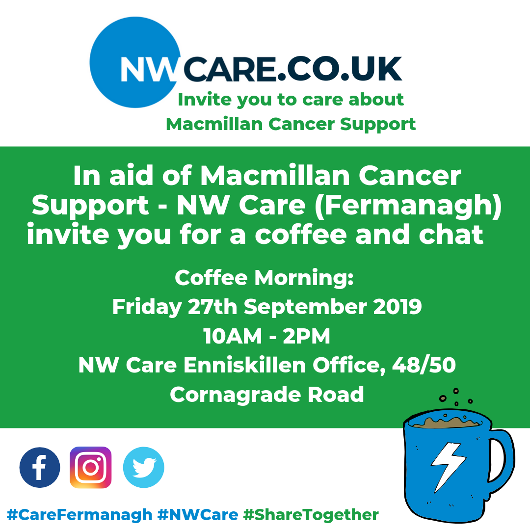 Macmillan in Northern Ireland Coffee Morning at NW Care Northern Ireland Enniskillen office on 27th Sept – please come along for a coffee and a chat